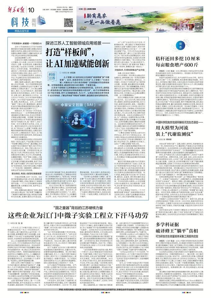 2026年1月21日,《新华日报》以《探访江苏人工智能领域应用场景——打造“样板间”, 让AI加速赋能创新》为题,报道了九游体育等入选江苏省“前沿技术应用场景建设示范名单”企业,在应用场景建设方面的实践与成效。