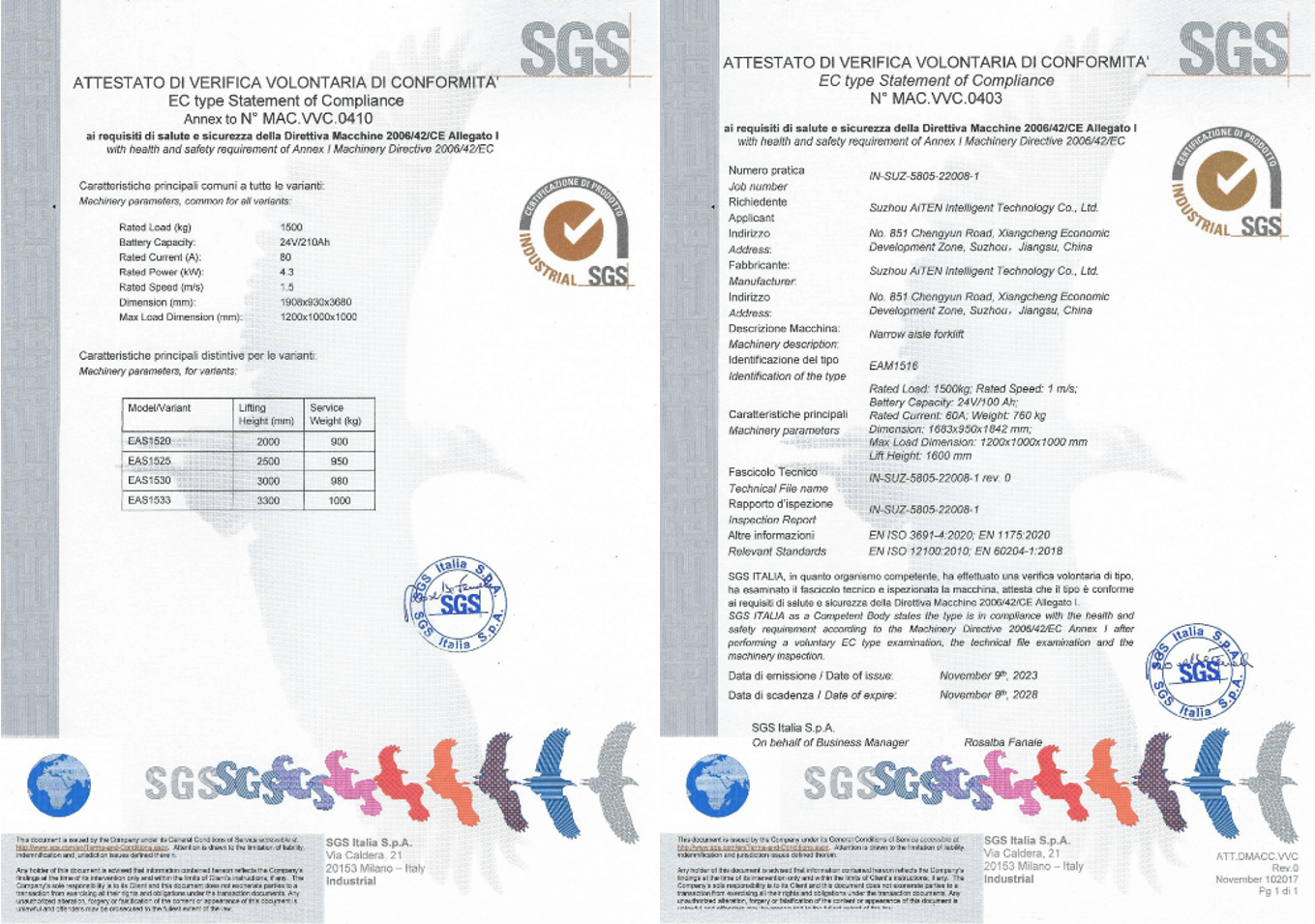 3. CE 标志(欧盟): 确保符合机械指令,强调对繁忙仓库等动态环境的风险评估,在这些环境中,叉车与行人和手动设备相互作用。为满足欧洲市场的法规要求,九游体育产品经过严格审核,为包括 MP10AM1516AE15、AS15 和其他产品在内的 AGV 产品获得了欧盟 CE 证书。
